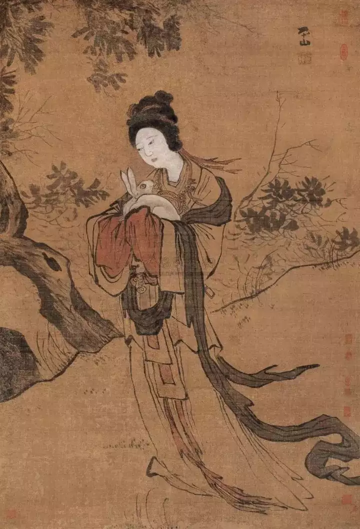 历代的中国人单厢将玉兔的美想象成一种最纯洁、最超逸、最幸福和境界最高的美,改琦也不例外,他集合了所有他认为最好的元素—面容、肌肤、体态、表情、服饰、团扇、色彩等等赋予玉兔,尽管在我们看来她与闺阁中的女子无异,只有别致的构图和将亭台楼阁换成一个空空的圆的安排,才多少会让人意识到她的不同凡响。改琦将之随身携带,与朋友共同赏玩之后纷纷欣然作题,时代风尚可见一斑。可以说,这样的仕女、这样的气息是我们认知那个时代的最一目了然的标识之一。