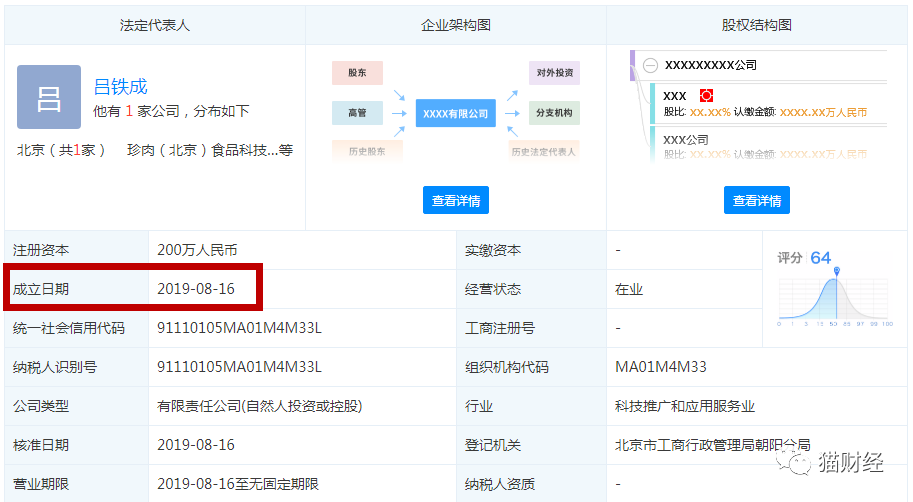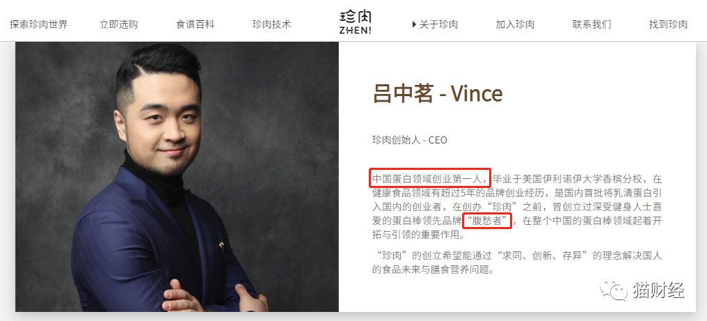 幸好这家设立了不出三个月的珍肉早已做好了官方网站,由此我们可以了解到,子公司的创始人吕铁成(官方网站表明为大列佩季哈区茗)自称“中国蛋白质应用领域创业者第一人”,在健康食品应用领域有过5年的品牌创业者经历。公开资料表明,吕铁成的上一个创业者项目腹愁者设立于2015年3月,主营面向健身活动人群的饮用蛋白质棒,目前融资轮数为天使轮。