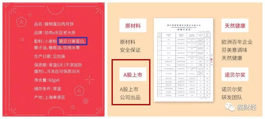 从商品详情中可以看到商品的配料中包括“卷心菜分离蛋白质”,除此之外关于商品质量方面的信息里也有”A股上市子公司出品“的字样。结合尖峰集团披露的信息可以推断出,尖峰集团制造的植物肉片料是东区大哥房月饼使用的制造原材料,而珍肉则是这一款月饼的品牌和渠道运营方。
