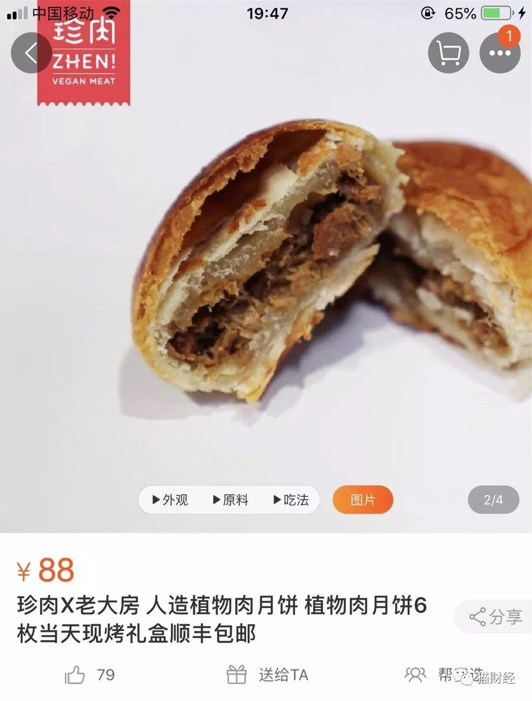 除此之外,珍肉的淘宝店也早已上线,店铺中唯一的一款商品正是与大哥房联署推出的“珍肉x大哥房人造植物肉月饼“。