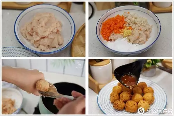 3、Haon中倒进小量的油,油烧至五成热后,把肉片挤成茄子,放入热油中炸至金黄色,全部炸好后,调火灾给热油升温,将茄子复炸后捞起保湿。
