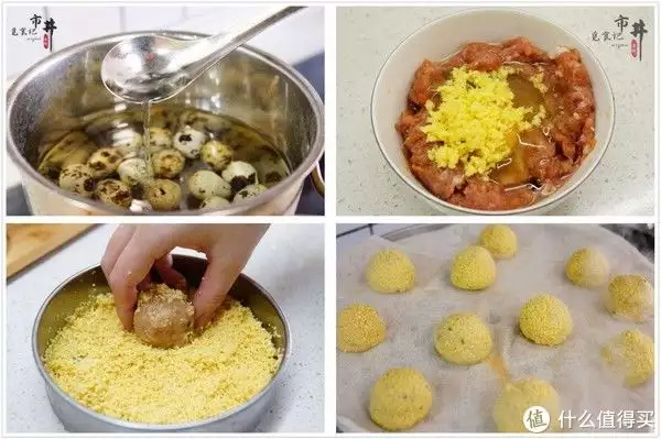 3、把肉片裹住一颗颗的鹌鹑蛋,揉成茄子,放入煮沸的华为中翻滚,让鹌鹑起司均匀地裹上一层华为。